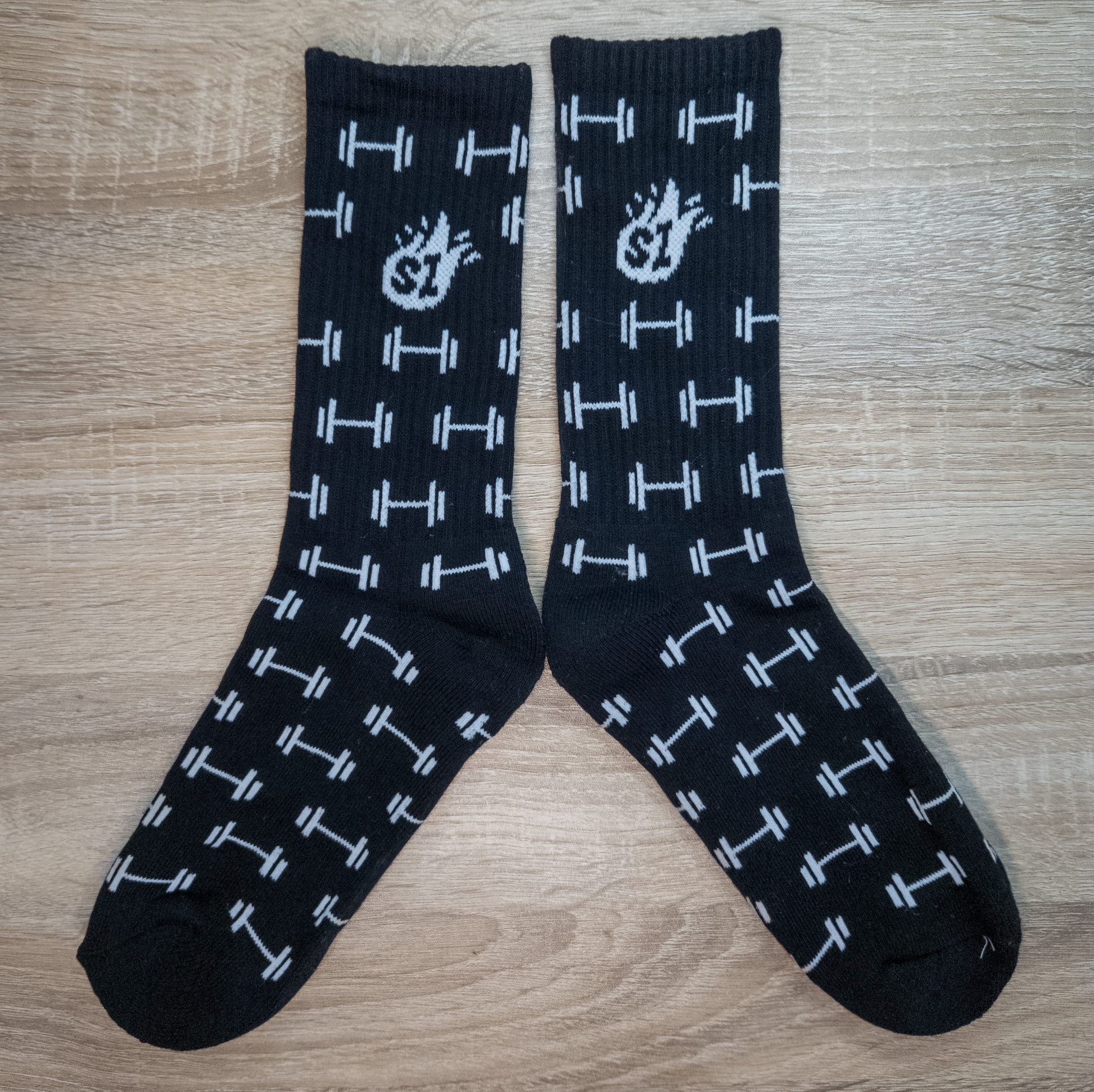 Black Crew Socks with a cool white Barbell design. Great for workouts or everyday wear.