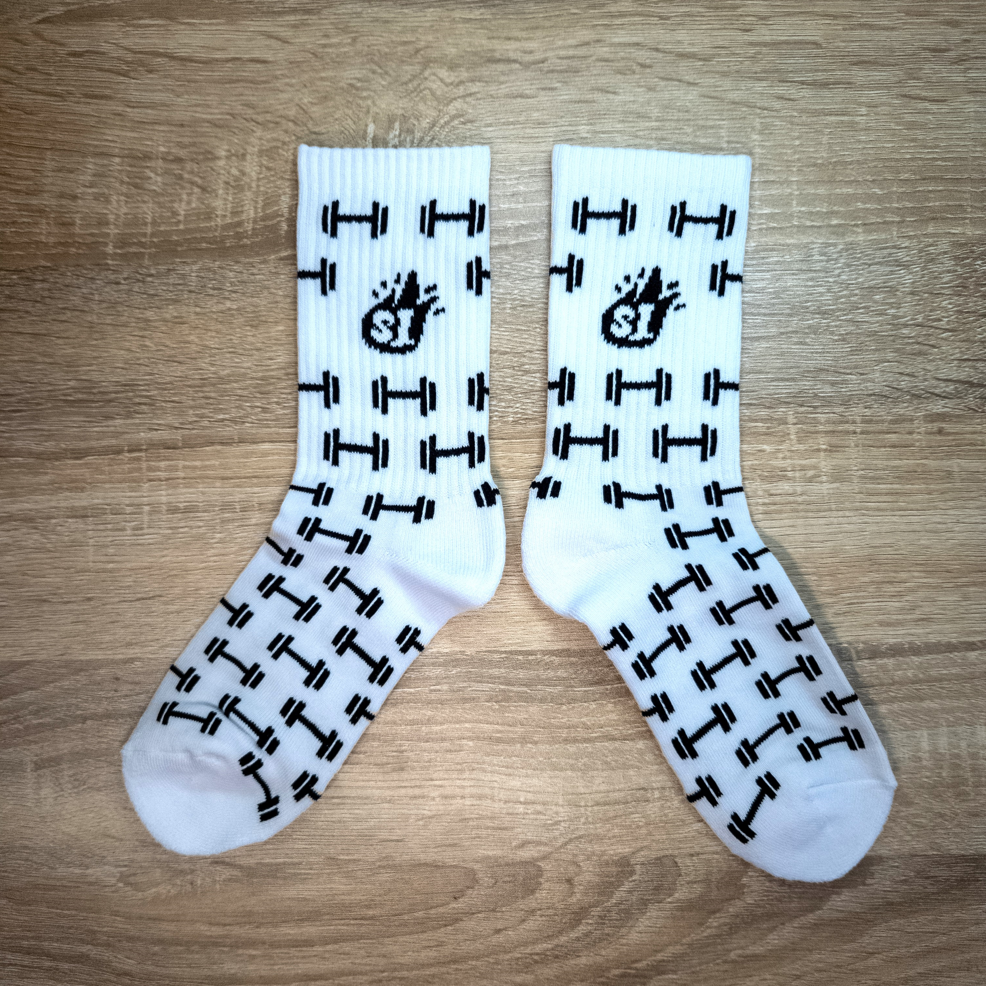 White Crew Socks with a cool black Barbell design. Great for workouts or everyday wear.